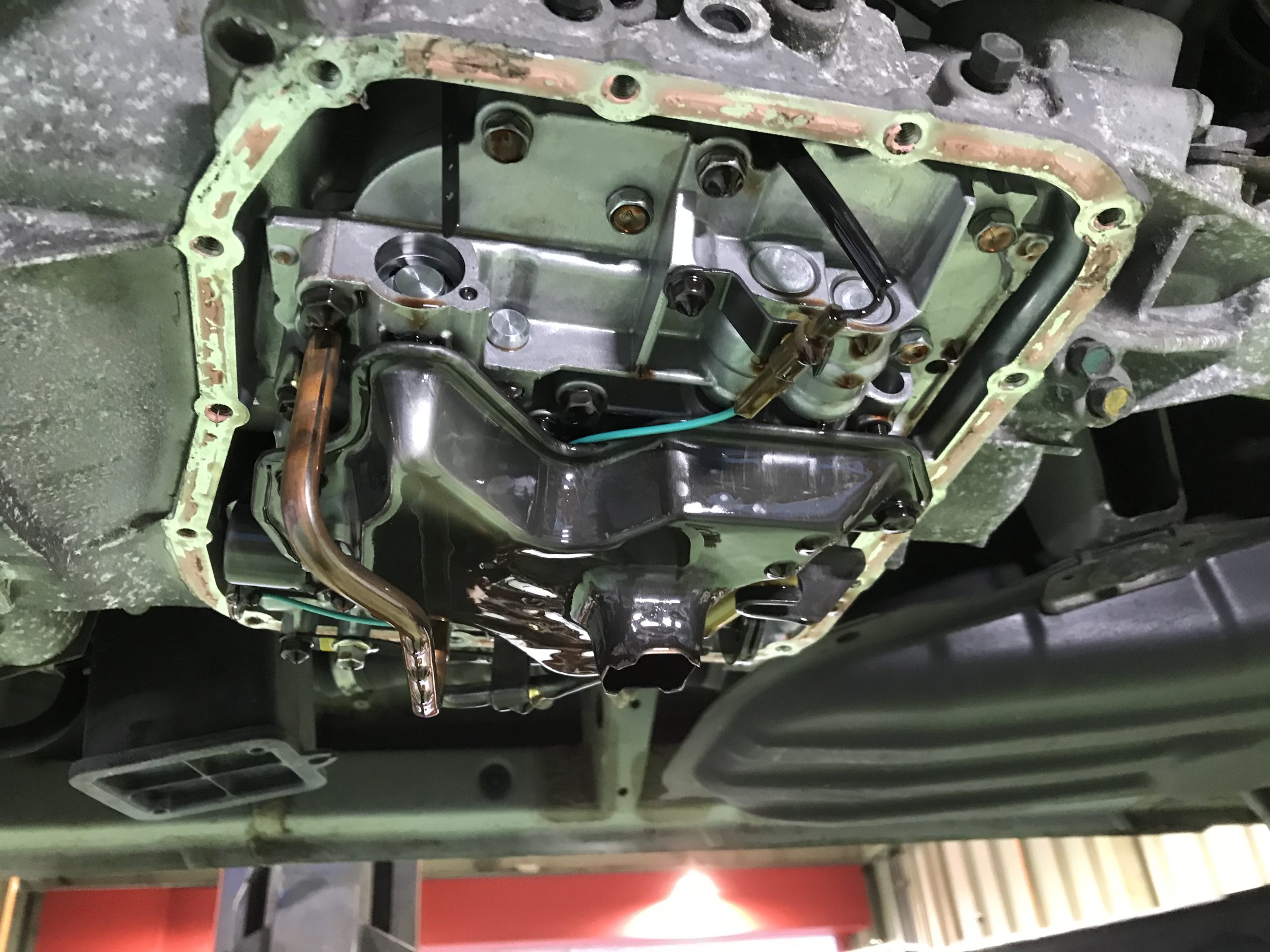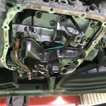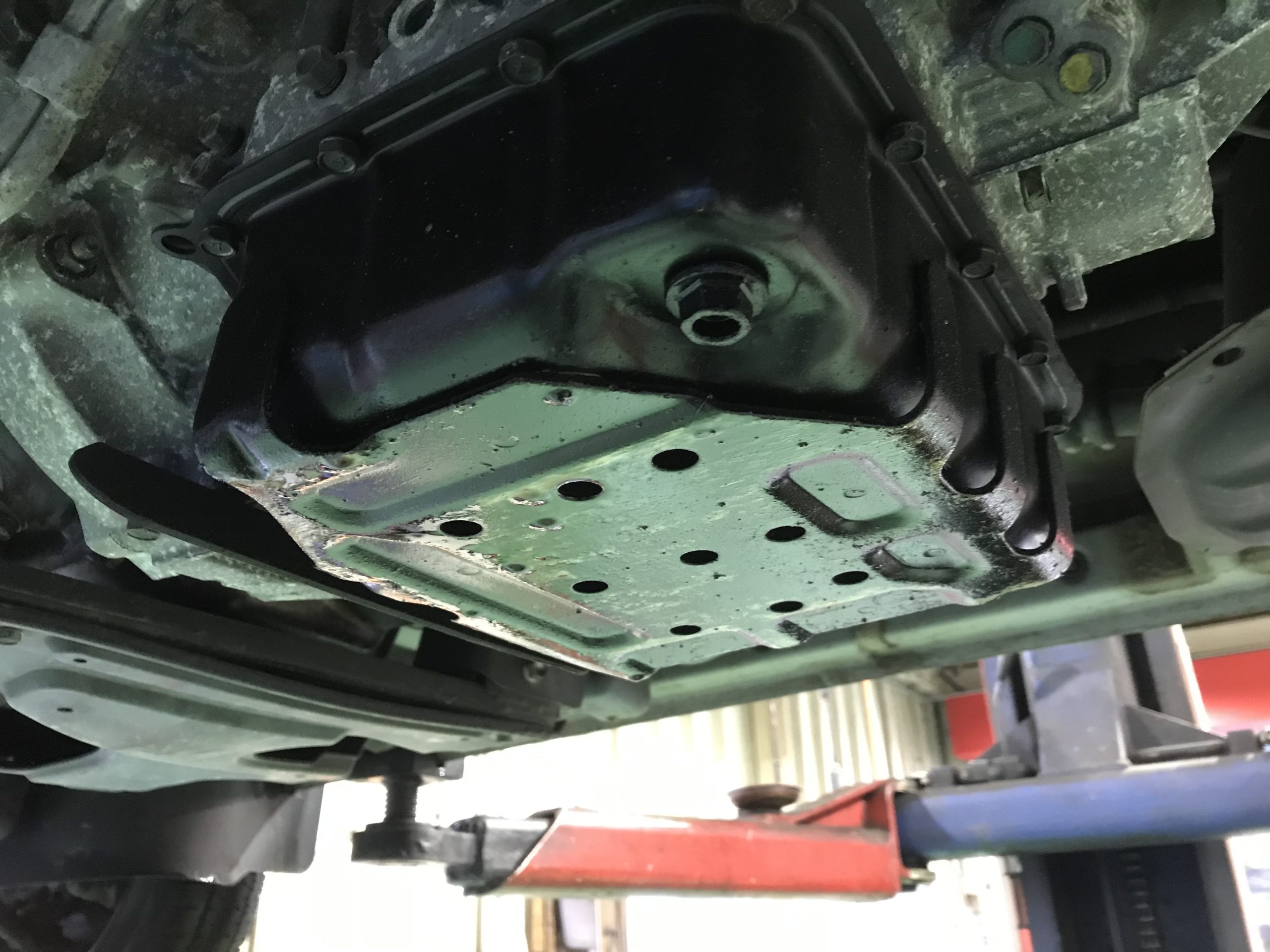 先日、車の下回りをぶつけたから見てほしいと言うお客様がご来店されました。リフトに上げて確認してみるとATのオイルパンをぶつけた様でATオイルの漏れを確認出来ました。このままでは非常にまずいのでオイルパンを交換します。