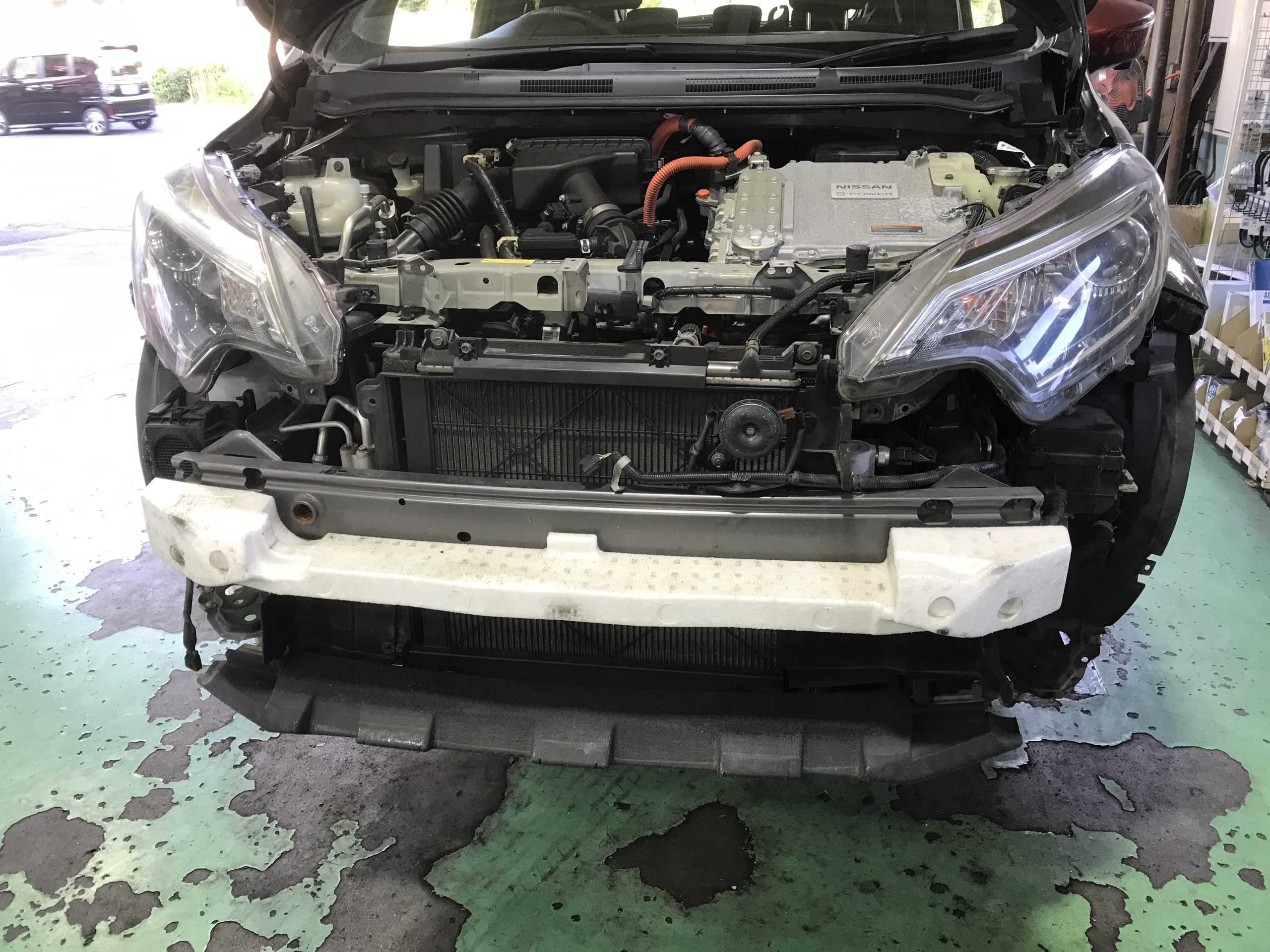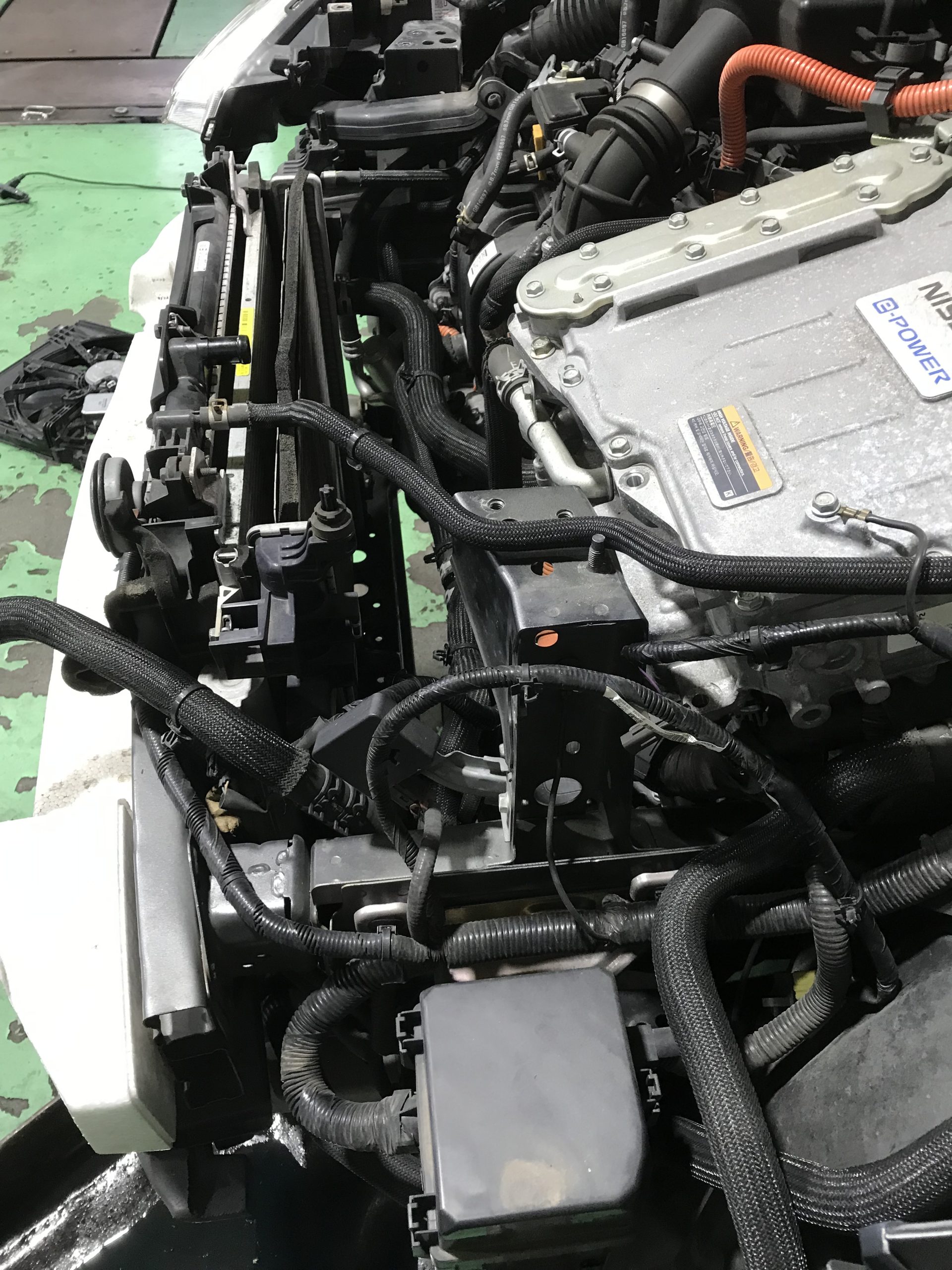 さて本日は日産ノートeパワーの修理です。 お客様からお話を聞いたところ、メーターに赤いランプが点灯したとの事です。どのランプか確認したところ、水温の警告灯で間違いない様です。