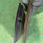 画像は摩耗したパッドど新品パッドとの比較になります。新品のパッド残量は9.5ミリですが古いパッドは1ミリ程しか残っていません。古いパッドをこのまま使い続ければ非常に危険です。