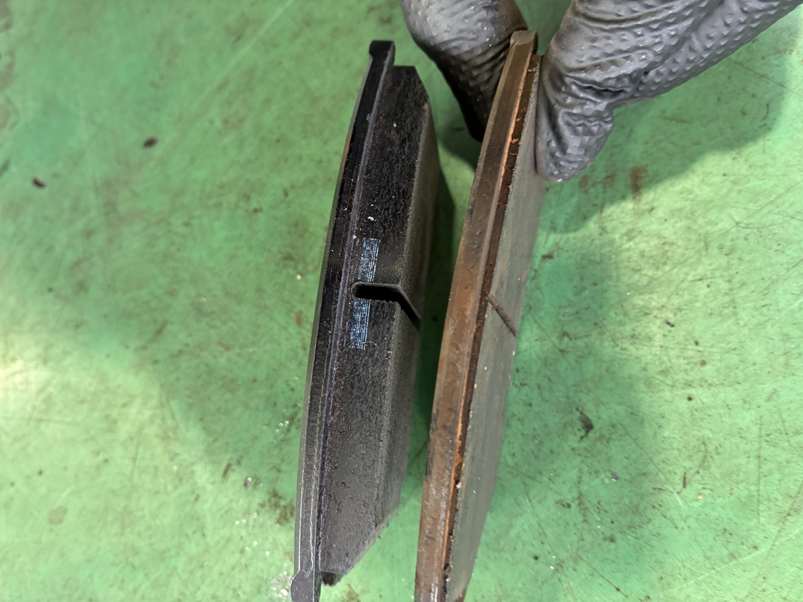 画像は摩耗したパッドど新品パッドとの比較になります。新品のパッド残量は9.5ミリですが古いパッドは1ミリ程しか残っていません。古いパッドをこのまま使い続ければ非常に危険です。