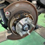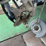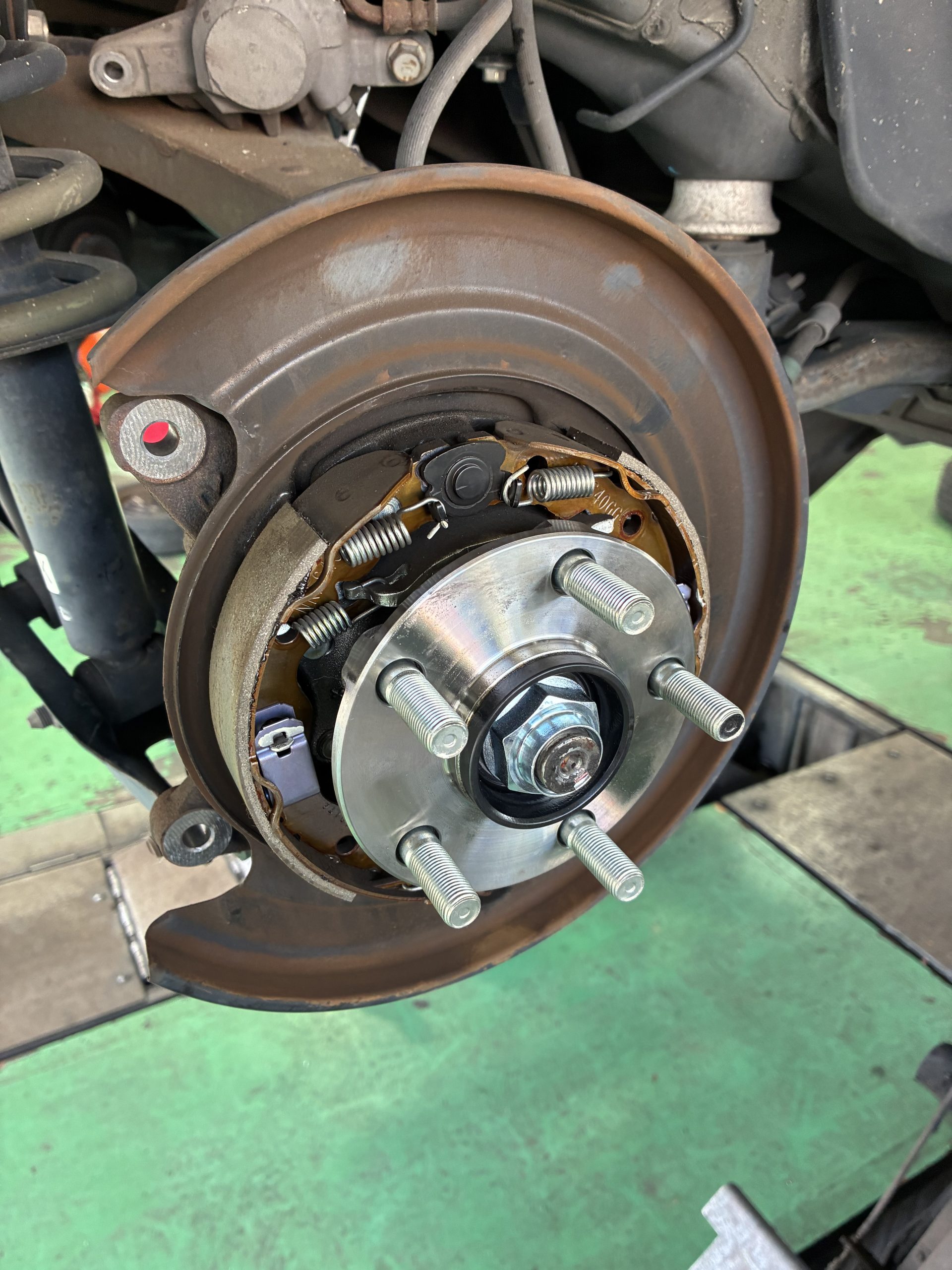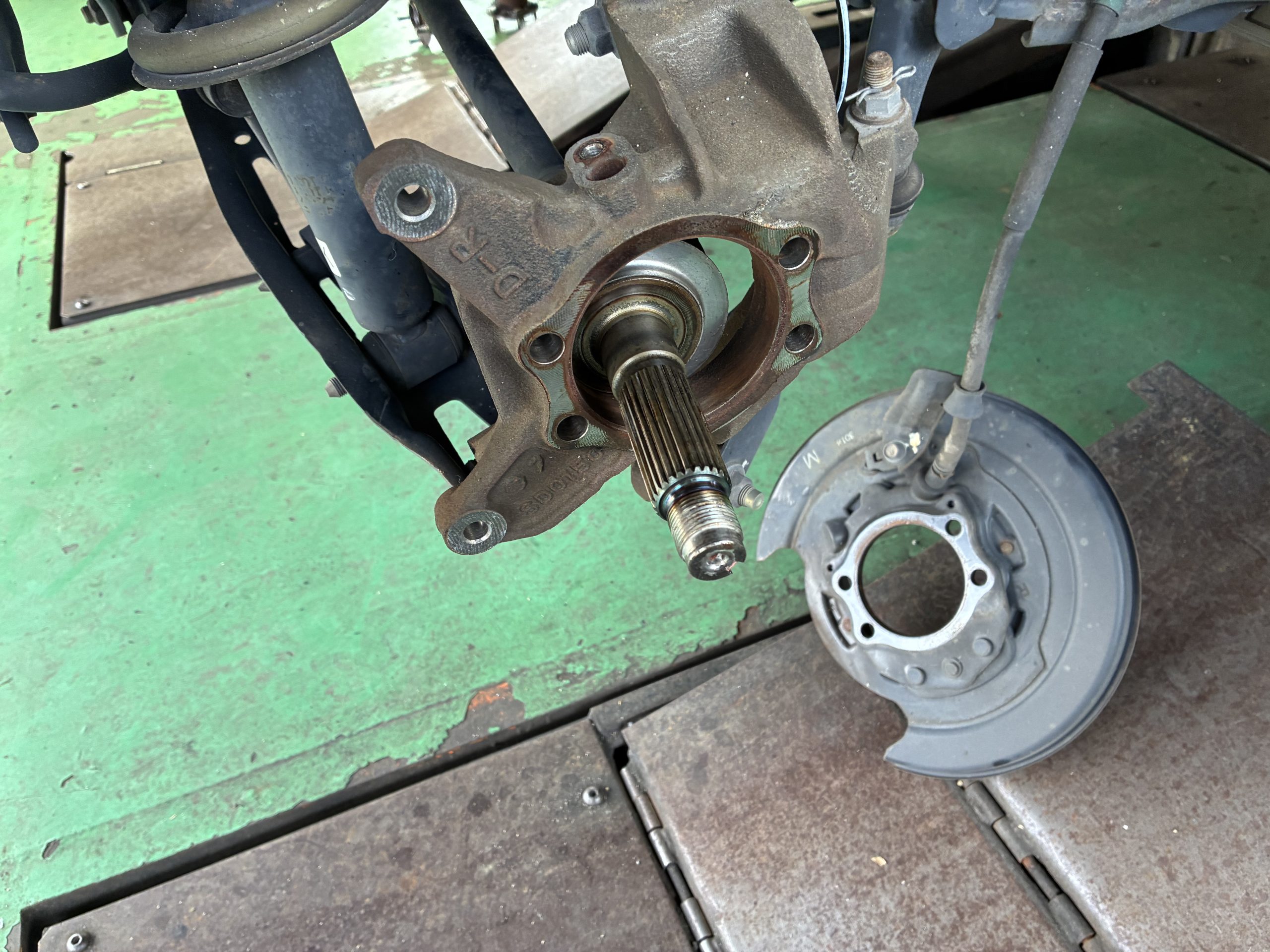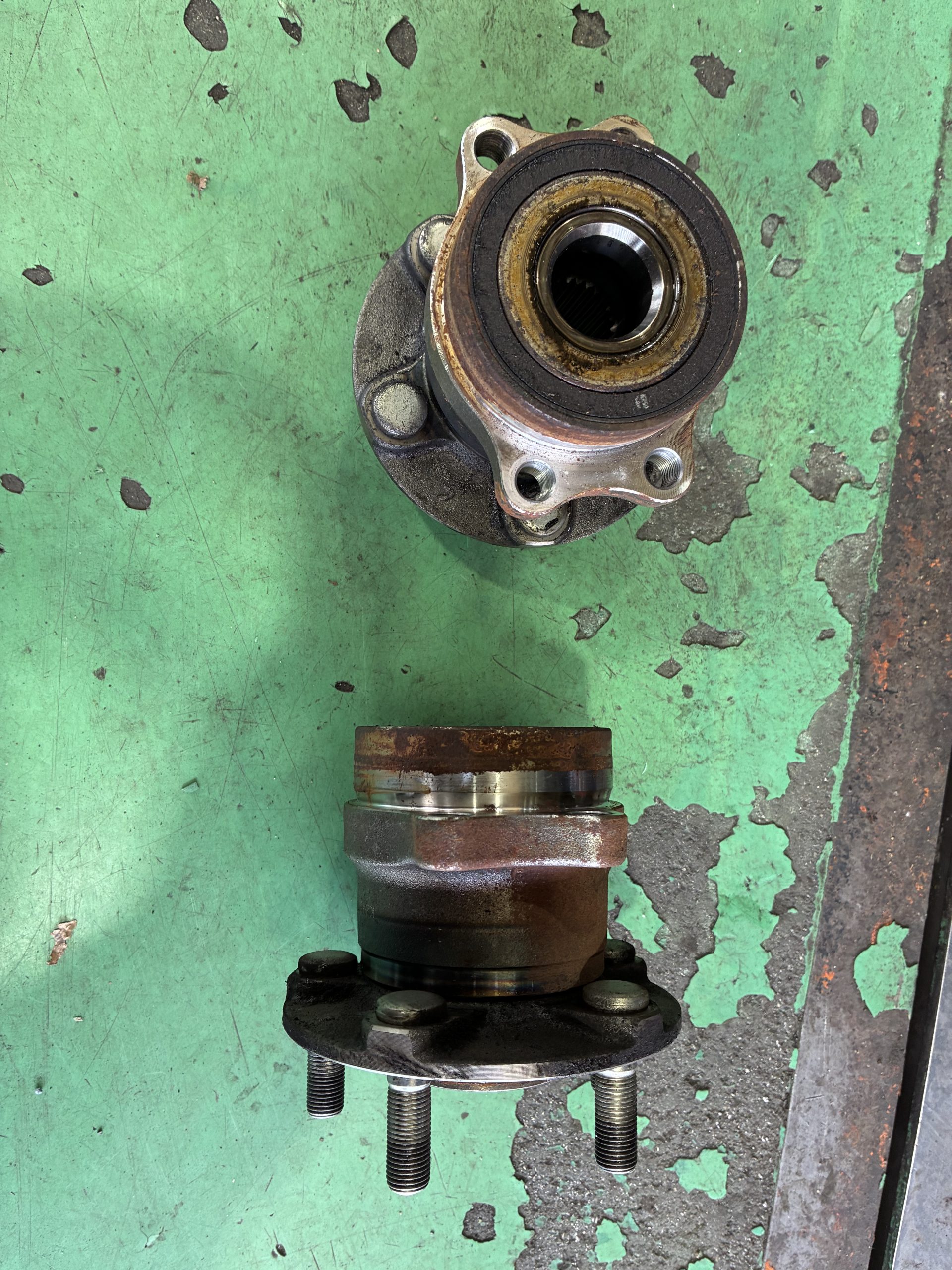 さて、本日は走行中にゴーゴーと異音が出ると言うご依頼の修理を行なっていきます。最初に異音の確認の為に試乗してみます。乗ってみると速度が上がるにつれ後ろ辺りからゴーゴーと鳴り始め、とても不快的です。恐らくリヤハブベアリングだと思われます。リフトに上げて確認すると、左右のベアリングから音が出ていましたので左右のベアリング交換ですね。すぐに部品を注文して交換します。